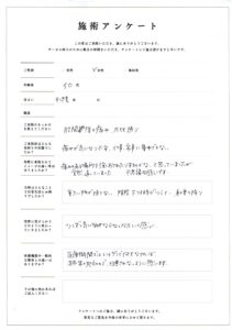 初回の施術で痛みは半減、2回目の施術で痛みはなくなり、3回目来院時は痛みはありませんでしたが、気になる所があったので、もう1度来院していただき、4回目で終了となりました。